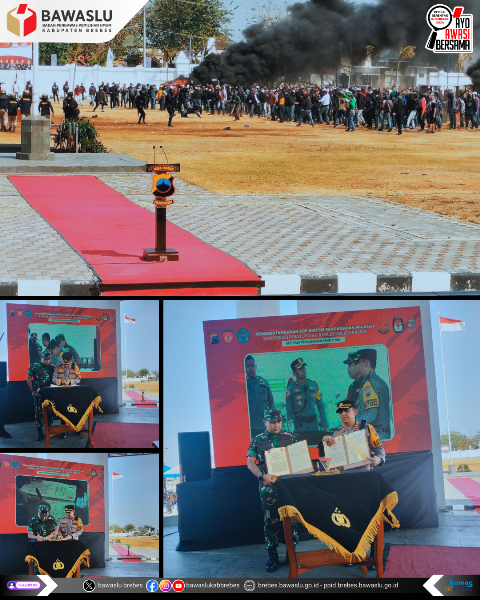 Brebes (6/09/2023) - Bawaslu Kabupaten Brebes hadir dalam kegiatan Simulasi Sistem Pengamanan Dalam Kota (Sispamkota) dalam rangka Pengamanan Wilayah Rayonisasi Pekalongan Raya yang dipusatkan di area Kantor Pemerintahan Terpadu Kabupaten Brebes. Simulasi tersebut melibatkan ribuan orang dari berbagai unsur, seperti Kodim, Brimob, Polres Brebes, Polres Tegal, Polresta Tegal Kota, Polres Pemalang, Polres Pekalongan, Polresta Pekalongan Kota, Polres Batang, Damkar, Satpol PP, Dinas Kesahatan dan Dinas Perhubungan. Kegiatan simulasi yang melibatkan ribuan personel TNI dan Polri dari tujuh Kabupaten/Kota eks Wil Pekalongan tersebut untuk meningkatkan kesiapsiagaan anggota TNI Polri dan pihak terkait lainnya dalam mengantisipasi gangguan kamtibmas dan pengamanan tahapan Pemilu 2024.