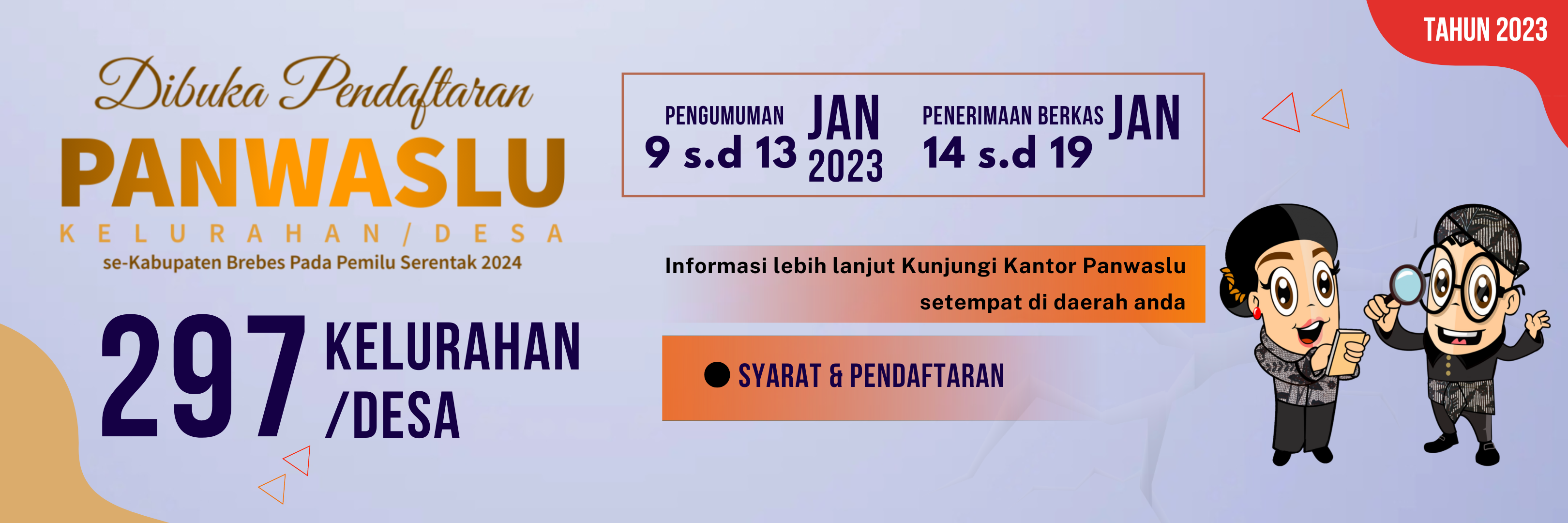 Untuk menjadi Panwaslu Kelurahan/Desa harus memenuhi syarat-syarat sebagai berikut: 1) Warga Negara Indonesia; 2) Pada saat pendaftaran berusia paling rendah 21 tahun; 3) Setia kepada Pancasila sebagai dasar negara, Undang-Undang Dasar Negara Republik Indonesia Tahun 1945, Negara Kesatuan Republik Indonesia, Bhinneka Tunggal Ika, dan cita-cita Proklamasi 17 Agustus 1945; 4) Mempunyai integritas, berkepribadian yang kuat, jujur, dan adil; 5) Memiliki kemampuan dan keahlian yang berkaitan dengan Penyelenggaraan Pemilu, ketatanegaraan, kepartaian, dan pengawasan Pemilu; 6) Berpendidikan paling rendah Sekolah Menengah Atas atau sederajat; 7) Berdomisili di kecamatan setempat yang dibuktikan dengan Kartu Tanda Penduduk (KTP); 8) Mampu secara jasmani, rohani, dan bebas dari penyalahgunaan narkotika; 9) Mengundurkan diri dari keanggotaan partai politik sekurang-kurangnya 5 tahun pada saat mendaftar sebagai calon; 10) Mengundurkan diri dari jabatan politik, jabatan di pemerintahan, dan/atau di badan usaha milik negara/badan usaha milik daerah apabila terpilih; 11) Tidak pernah dipidana penjara berdasarkan putusan pengadilan yang telah memperoleh kekuatan hukum tetap karena melakukan tindak pidana yang diancam dengan pidana penjara 5 (lima) tahun atau lebih; 12) Bersedia bekerja penuh waktu yang dibuktikan dengan surat pernyataan; 13) Bersedia tidak menduduki jabatan politik, jabatan di pemerintahan, dan/atau badan usaha milik negara/badan usaha milik daerah selama masa keanggotaan apabila terpilih; 14) Tidak berada dalam ikatan perkawinan dengan sesama Penyelenggara Pemilu; dan 15) Mendapatkan izin dari atasan langsung untuk mengikuti seleksi dan bekerja penuh waktu apabila terpilih. Mengenai perkembangan informasi lebih detail, bisa mengikuti akun media sosial Bawaslu Kabupaten Brebes dan akun media sosial Panwaslu Kecamatan se-Kabupaten Brebes atau datang langsung ke Kantor Panwaslu Kecamatan setempat. UNDUH BERKAS