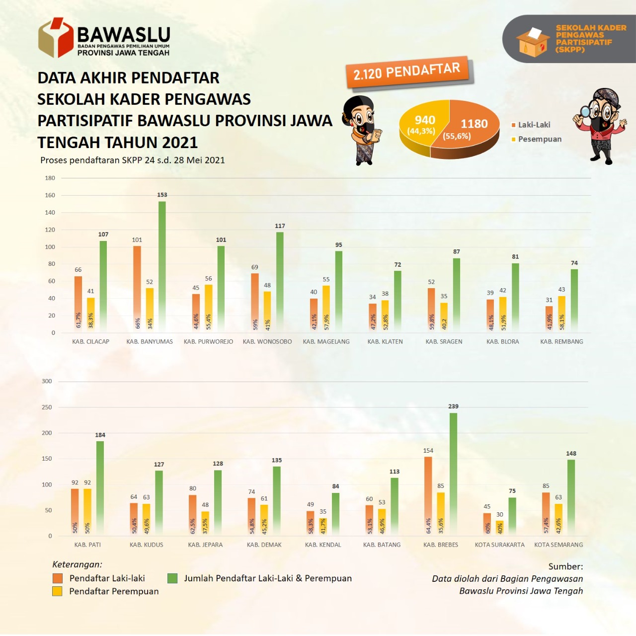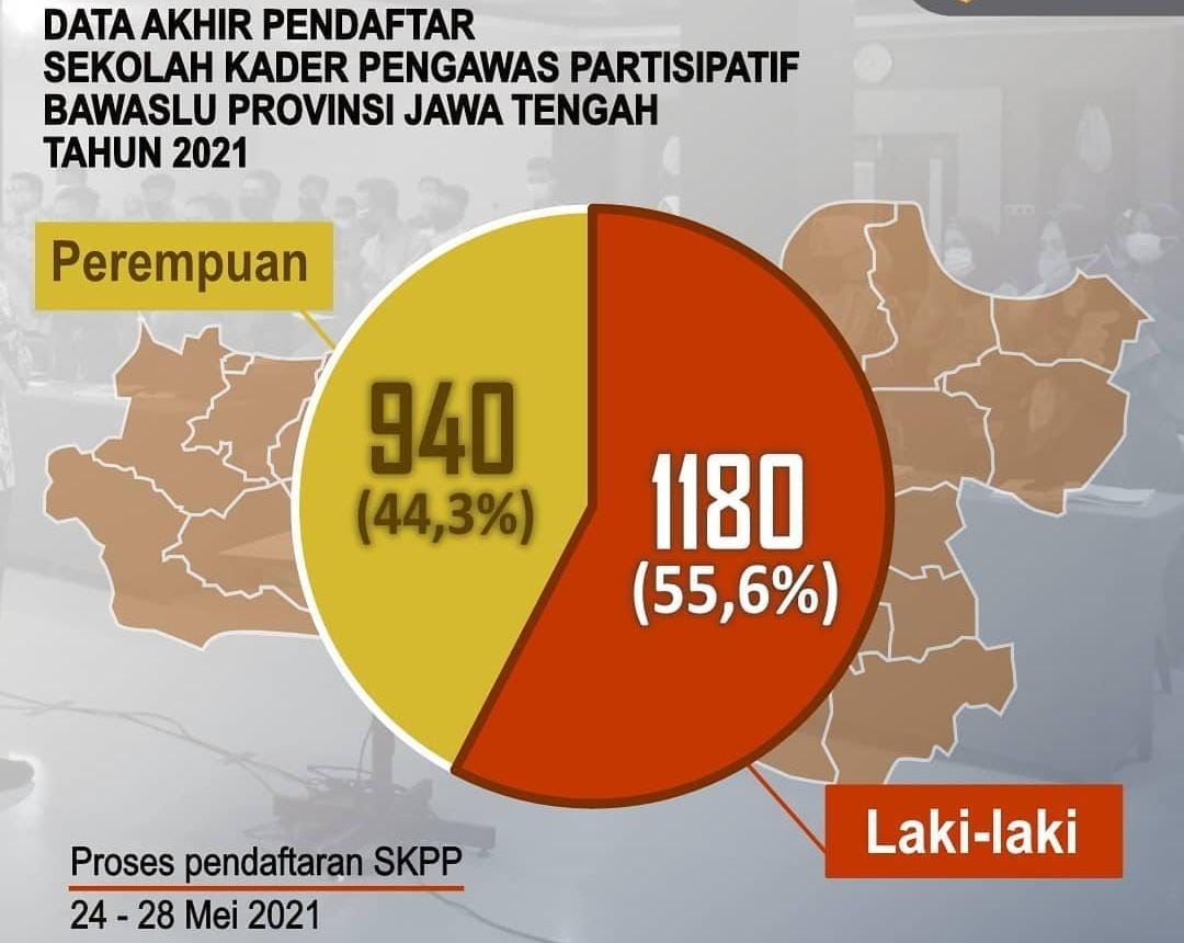 Brebes, Bawaslu Kab. Brebes – Selama kurun waktu dibukanya pendaftaran program Sekolah Kader Pengawas Partisipatif (SKPP) melalui kanal website Bawaslu RI dari masa pendaftaran 24 – 28 Mei 2021, Bawaslu Kabupaten Brebes mendapati jumlah pendaftar terbanyak se Provinsi Jawa Tengah dari 12 Kabupaten/Kota di lingkungan Bawaslu Provinsi Jawa Tengah yang membuka pendaftaran program SKPP, dengan total pendaftar 239 pendaftar. Data terakhir pendaftaran SKPP Bawaslu Provinsi Jawa Tengah terdapat 2.120, yang terdiri dari 940 perempuan dan 1180 laki-laki.