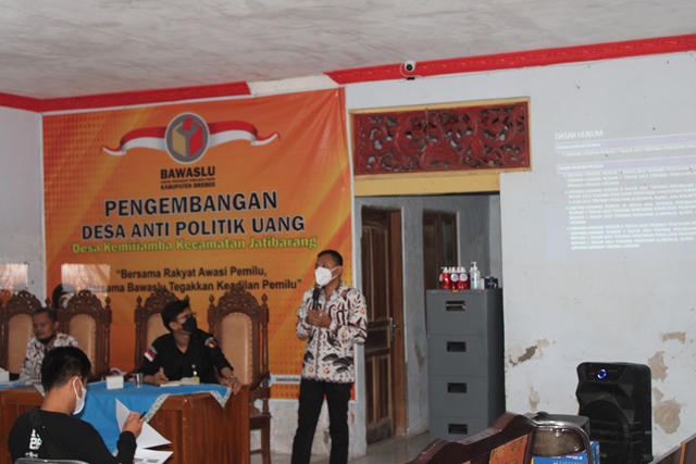 Bawaslu Kabupaten Brebes – Koordinator Divisi Hukum dan Data Informasi Bawaslu Kabupaten Brebes Rudi menyampaikan beberapa materi kaitannya dengan politik uang dalam Pemilihan Umum dan Pemilihan Kepala Daerah pada acara yang merupakan program lanjutan Bawaslu Kabupaten Brebes, yaitu pengembangan Desa Anti Politik Uang, yang bertempat di Desa Kemiriamba, Kec. Jatibarang, Selasa (8 Juni 2021).