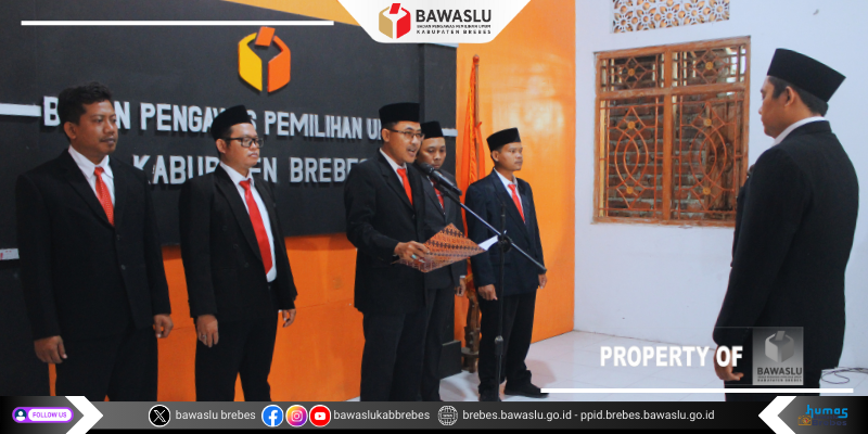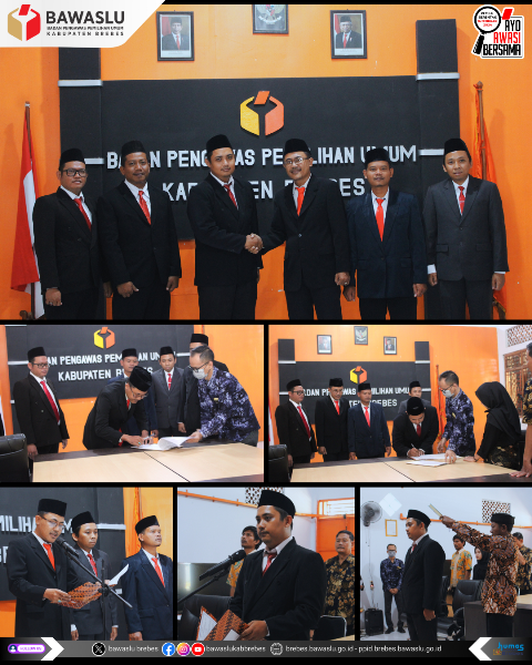 Brebes – Ketua dan Anggota Bawaslu Kabupaten Brebes melantik satu Pengganti Antar Waktu (PAW) Anggota Panwaslu Kecamatan Wanasari (10/09/2023). Kegiatan pelantikan diawali dengan pengambilan sumpah janji sebagai anggota panwaslu kecamatan, kemudian penandatanganan berita acara sumpah janji dan pembacaan pakta integritas.