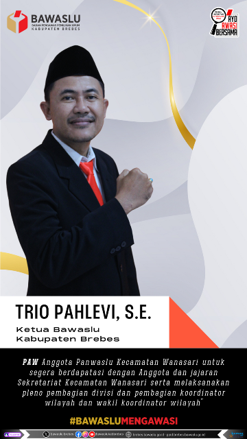 Ketua Bawaslu Kabupaten Brebes Trio Pahlevi meminta kepada PAW Anggota Panwaslu Kecamatan Wanasari untuk segera beradapatasi dengan Anggota dan jajaran Sekretariat Kecamatan Wanasari serta melaksanakan pleno pembagian divisi dan pembagian koordinator wilayah dan wakil koordinator wilayah.