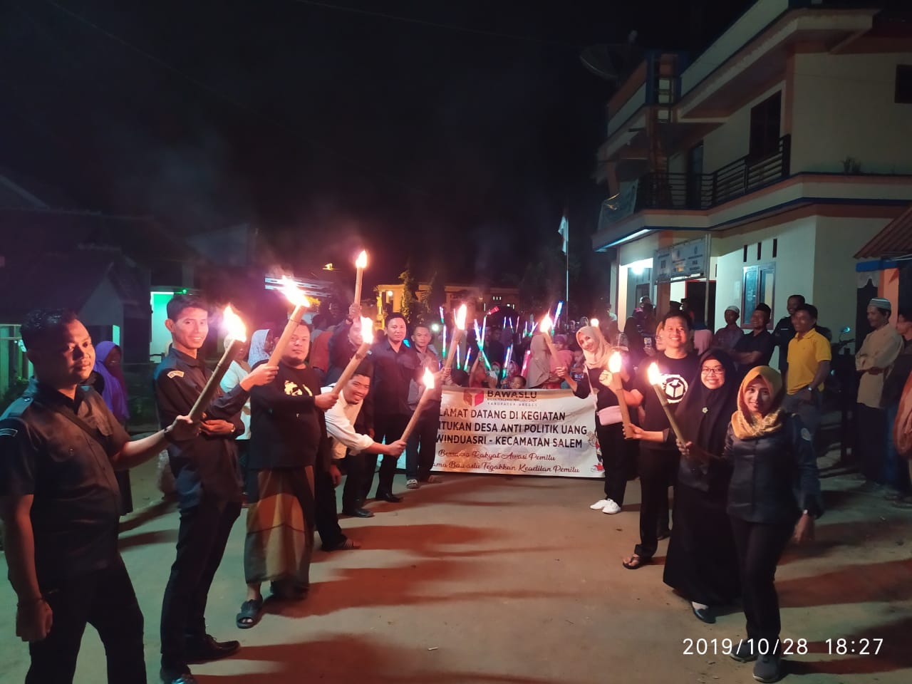 Brebes – Bawaslu Kabupaten Brebes menyelenggarakan pawai obor dalam rangka pembinaan keempat pembentukan desa anti politik uang di Desa Winduasri, Kecamatan Salem, Kabupaten Brebes pada hari Senin, 28 Oktober 2019. Peserta pawai obor adalah masyarakat Desa Winduasri yang kebanyakan dari kalangan anak-anak, dan ibu-ibu.